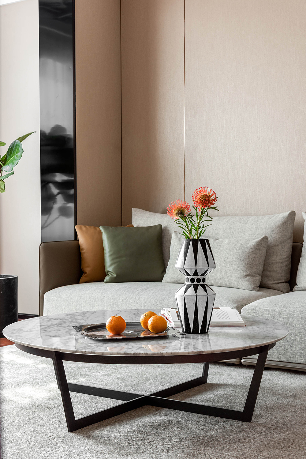 在拥有绝佳采光的客厅中,鲜亮颜色的座椅唤醒了空间的活力。绿植与果盘的点缀,营造出轻松自然的氛围。所有细节的和谐搭配,塑造出客厅的形与神。