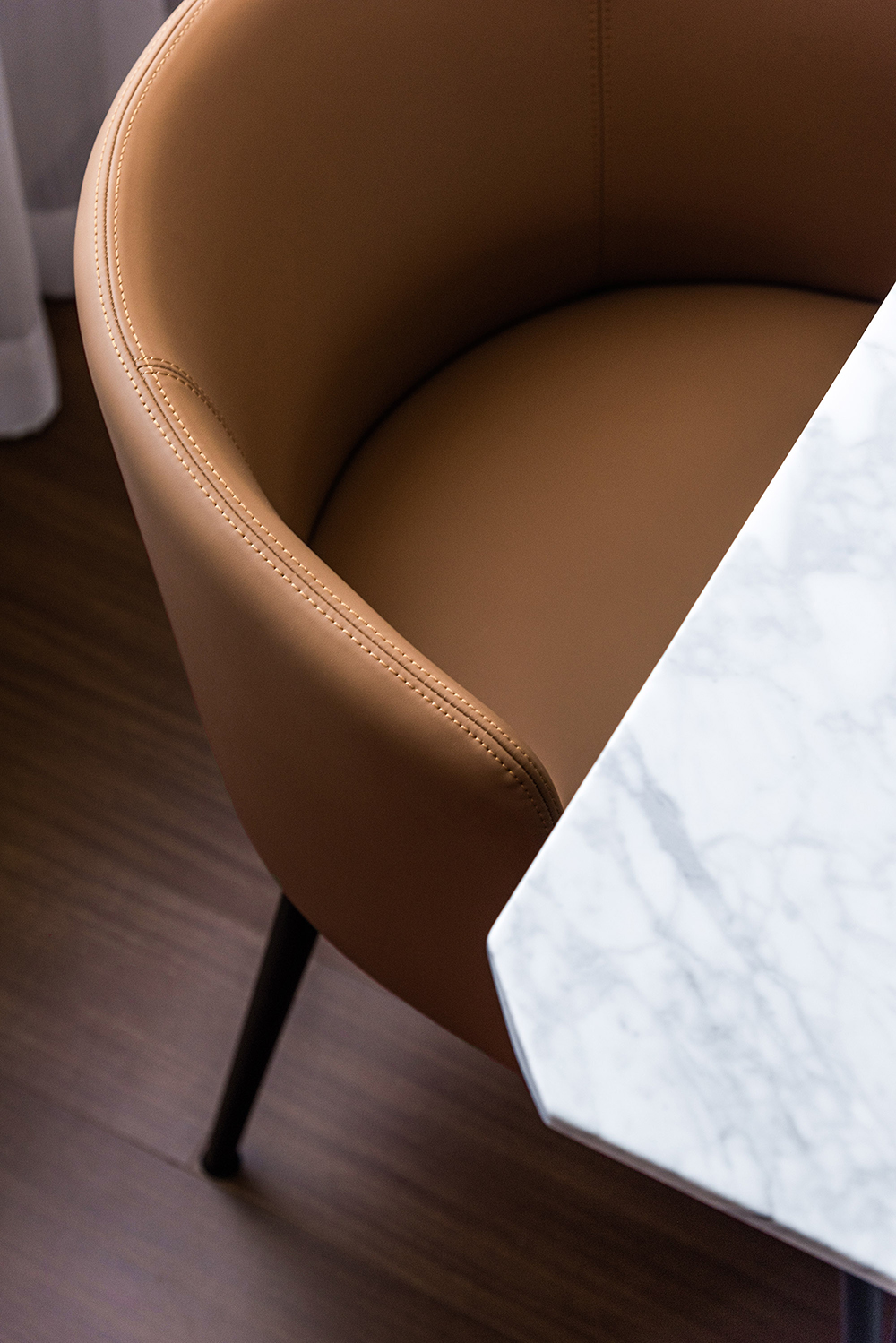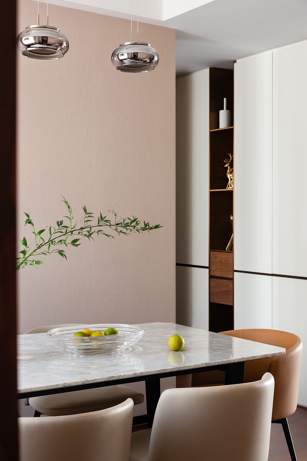 独立式餐厅能够很好地区隔出不同的空间,达到结构化设计的效果。器具别出心裁的设计为空间增添了浓厚的艺术气息,与大理石肌理的桌面形成了默契统一。在吊灯的照射下,倒映出物体之间的窃窃私语。