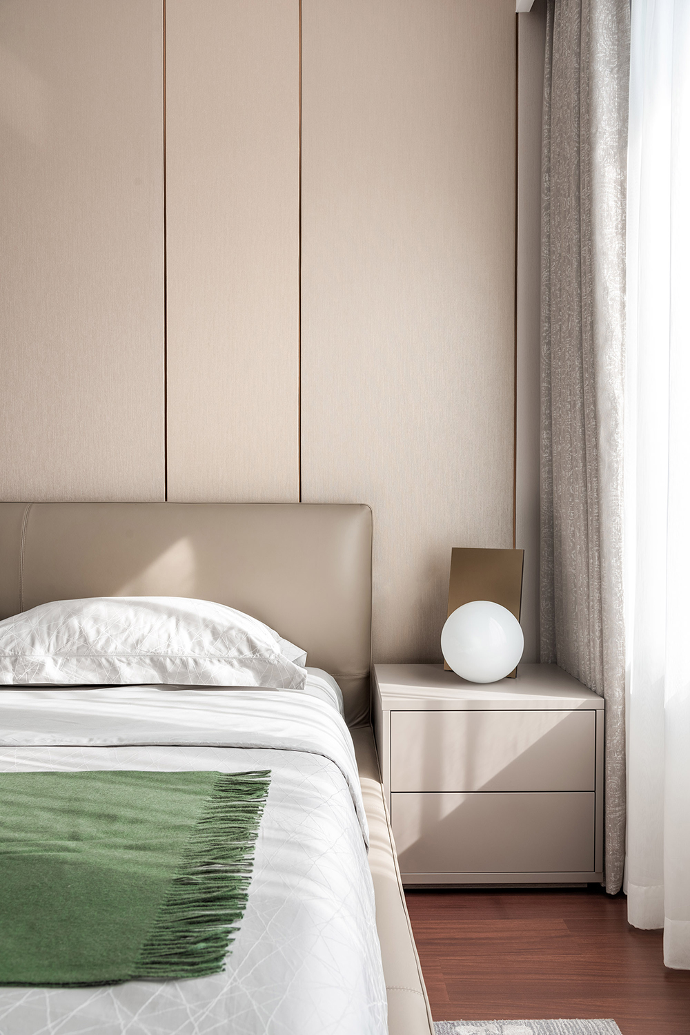浅色系组合的主卧,似有简约而又素雅的境界。同为米色系的床体与背景墙增加了空间的协调感。艺术元素的植入,让艺术感与居住者的气场共融。