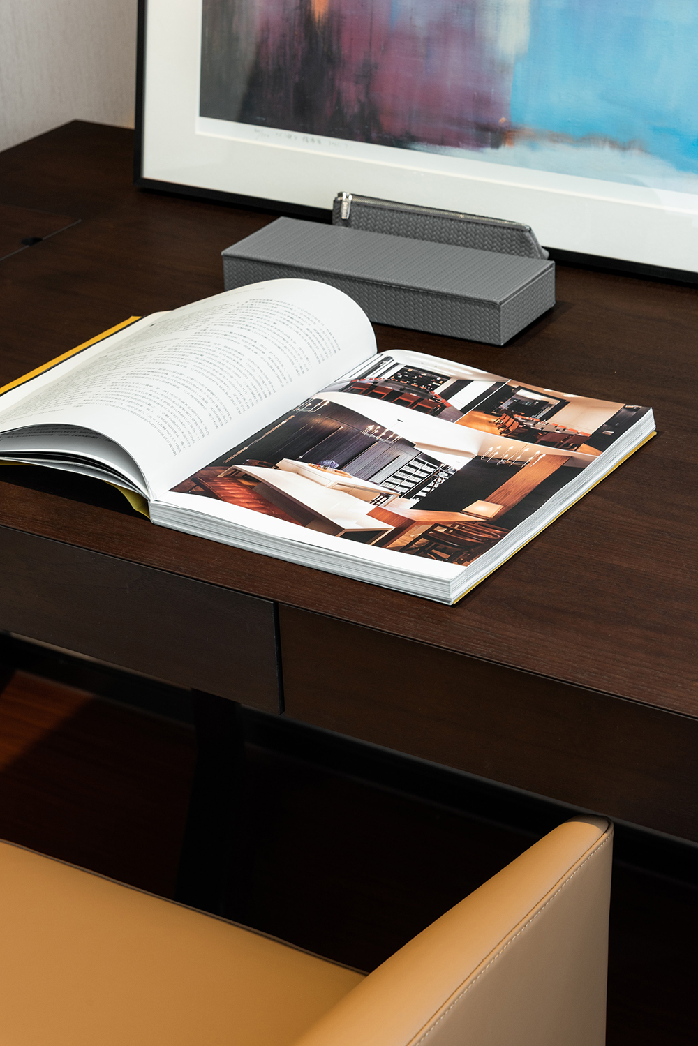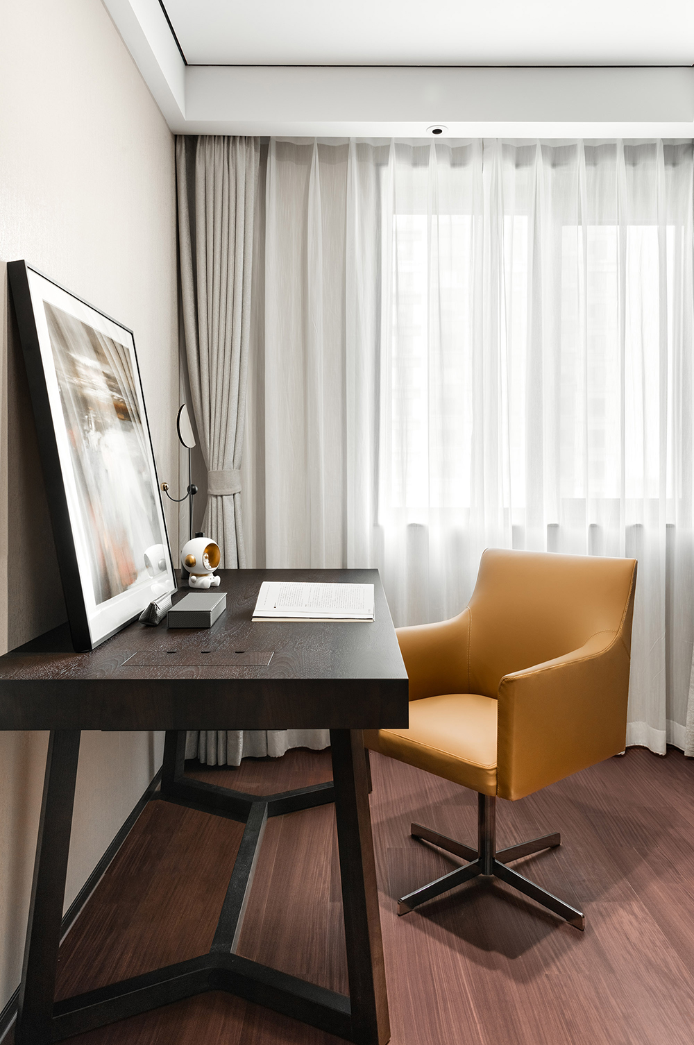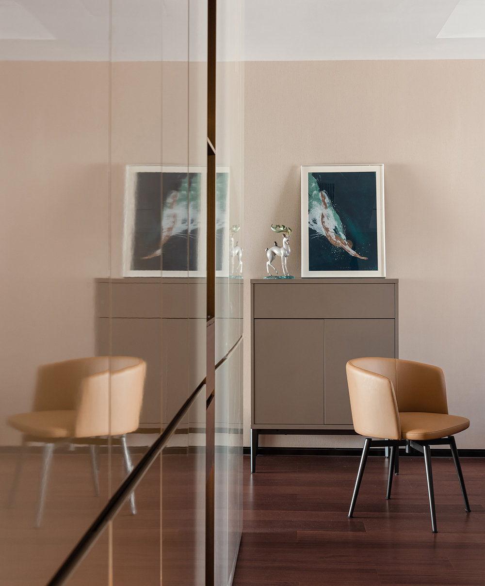 恬静怡然的空间,最能让躁动的心沉静下来。书房的黑白书柜与橙色座椅、线条与块面,既独立又相容,相互统一于整体的空间结构,散发出空阔淡泊的风度。